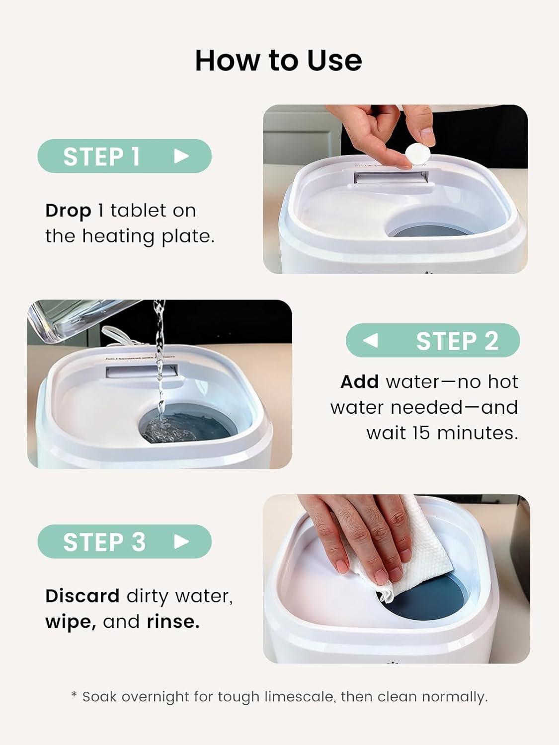Notes: For best results, use with purified water. Hard-water areas may require more frequent descaling. For heavy buildup, dissolve one tablet and let it sit overnight before rinsing.
