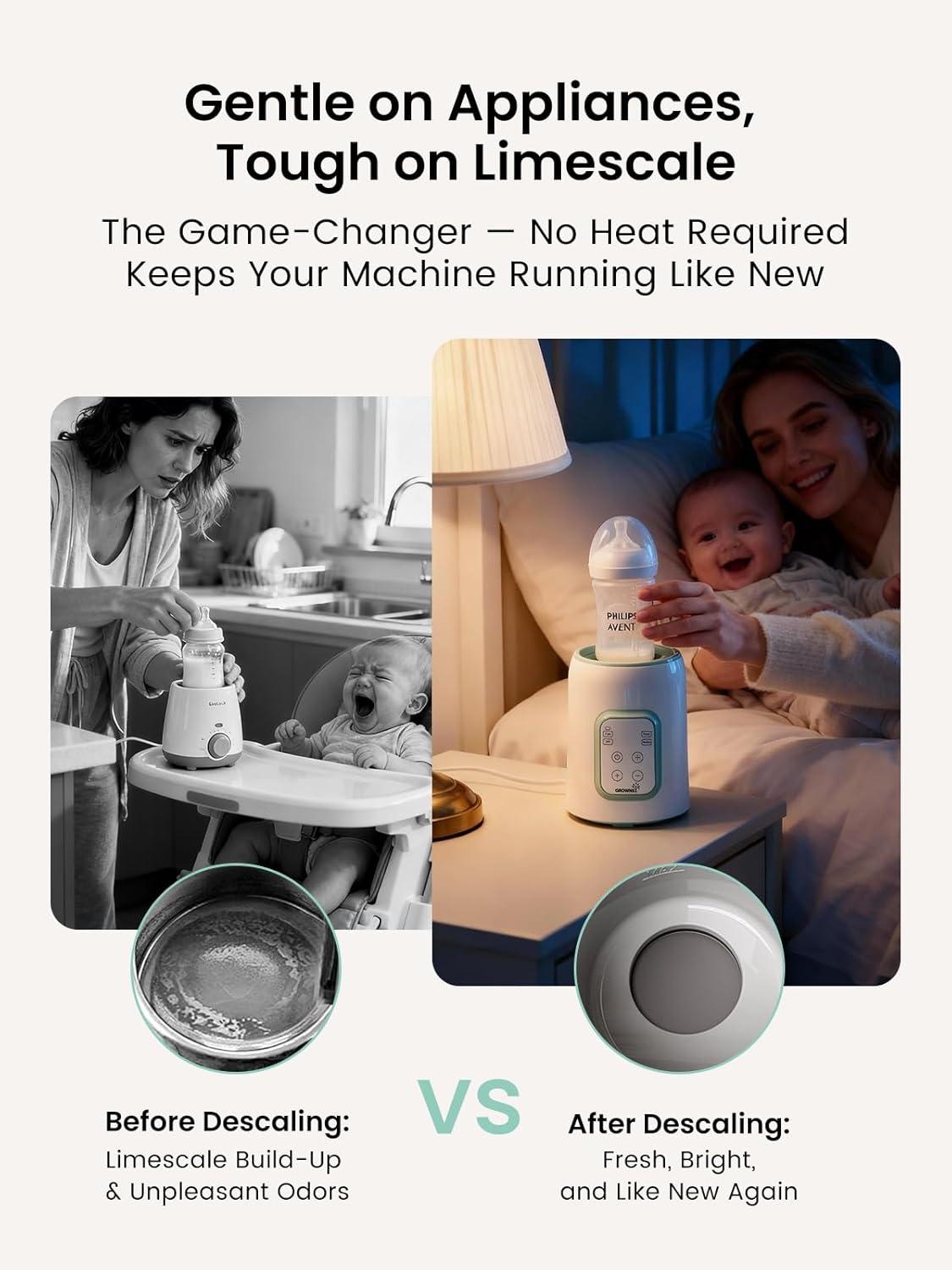 Gentle & Effective Formula: Made with gentle, fragrance-free, plant-based citric acid. Gentle yet effective at removing limescale and milk residue, leaving no residue or odor. Safe for cleaning items used by babies.