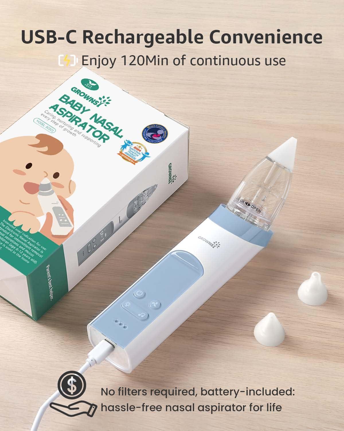 SAFE AND COMFORTABLE: Engineered by Pediatric ENTs, GROWNSY's patented baby nose sucker offers a unique anti-backflow technology. Experience the comfort of 3 food-grade silicone tips, designed to be ultra-gentle on your newborn's delicate nasal passages. Prioritizing your child's safety and comfort, always. Newborn essentials must haves